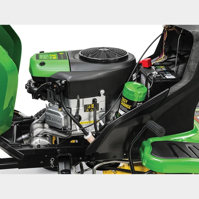 The 24-hp (17.9-kW) V-twin extended-life series (ELS) engine provides plenty of power to handle tough mulching. mowing. and bagging conditions.