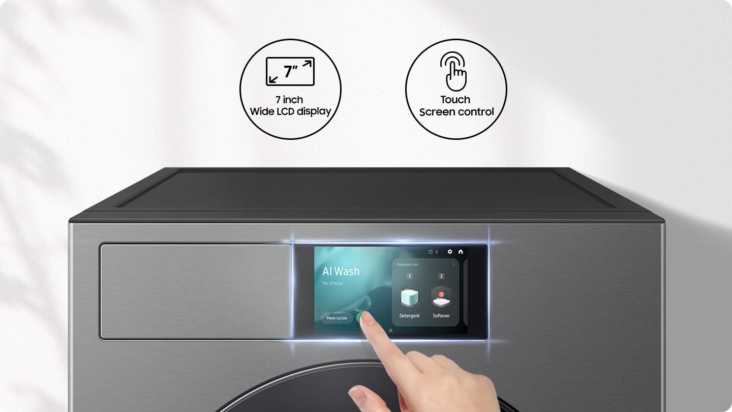 Enjoy a simple way to wash. The AI Home acts as an intuitive control center. offering clear information and touchscreen control. It also personalises your washing by remembering your habits. suggesting cycles* and displaying timely information.