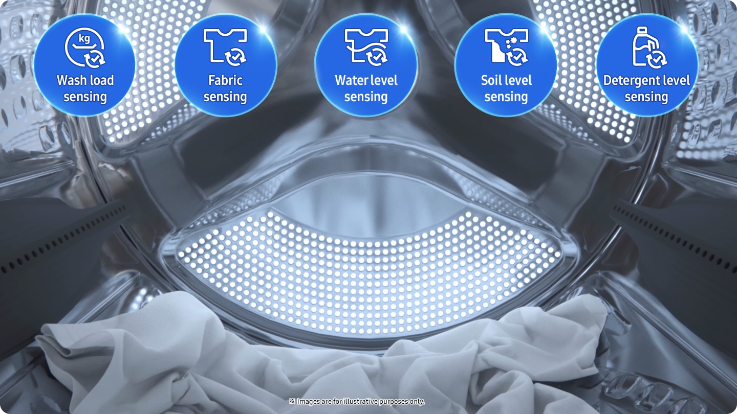 Wash clothes thoroughly*. but gently with less water and detergent. AI Wash uses advanced sensing to detect the weight and softness of the fabric and continually monitor the level of soiling. It then intelligently adjusts the water and detergent and the soaking. rinsing and spinning times.