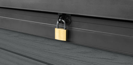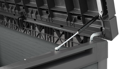 Regain your spacious. clutter-free outdoor space with the new Cortina Storage Box. also known as the Cortina 200. Double-walled EvotechTM panels give this outdoor storage box extra stability and sturdiness. making it ideal for home and utility use. Ultra-durable dent-free resin and UV coating give Cortina all-weather capability to withstand the elements for years with zero maintenance. Cortina features a beautiful wood texture and two-tone design that blends into any outdoor setting. The overhang top cover and smooth dual-piston system keep water and fingers safe while providing easy top access to the 200-gallon/757-liter space. Ideal for storing garden mats and sports equipment. as well as large tools that can be locked securely.