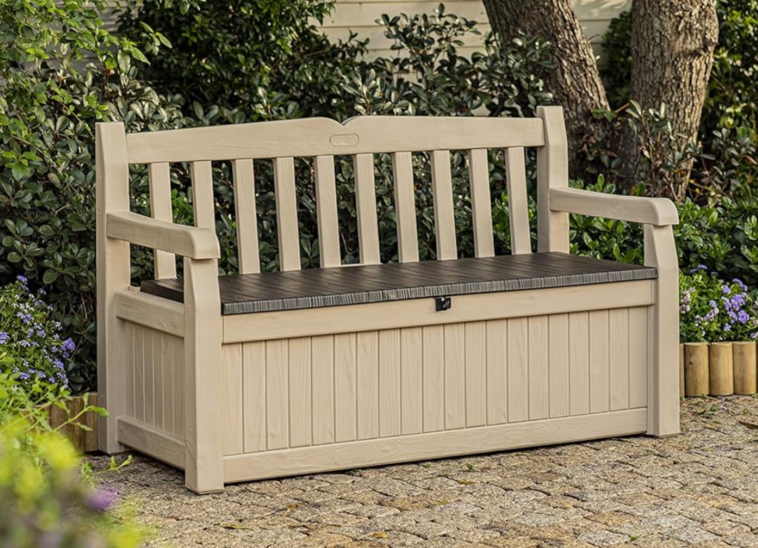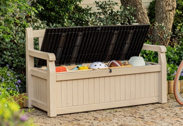 You can never have too much outdoor storage or too much durable yet elegant outdoor furniture. The fully weatherproof Eden garden bench storage box is ideal for outdoor use and can accommodate up to two adults and store patio accessories. lounge mats and other needs with a 265L/65g capacity Keep items dry and well ventilated. In addition to its wood-style accents. the Eden bench is also lockable for added security and peace of mind.