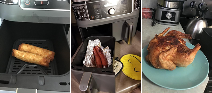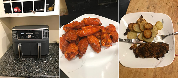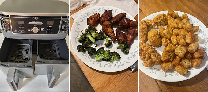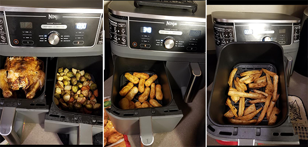 I can't believe I ever got by without Ninja in my life. First. I can roast a chicken in under an hour that is better than any rotisserie chicken you can buy. I rub a little olive oil on my roasting hen and season. put it in my air fryer on roast at 350 and miracles happen. I love that I can be making 2 different things at once and I can using Smart Finish have them get done at the same time. Foods are done quicker and nothing is greasy. this is healthier eating and everything seems to taste better too. Cleanup is a breeze. I use a damp sponge and haven't needed to soak or scrub yet. Another awesome feature. cool down at the end of the cooking cycle. I can even adjust the timer down to 0 to get the fryer to cycle down. You can use baskets separately or together to fry. bake. roast. reheat foods. dehydrate or even air broil. The match cook function means you can put the same thing in both baskets to double your capacity to make just about anything. As if all these features aren't enough. you can find so many recipe ideas online tailored to Ninja Foodi products. I have loved most that I tried. This air fryer is more than a time saver. it keeps my kitchen so much cooler and has really allowed me to be creative and made it possible to make meals in a pinch.