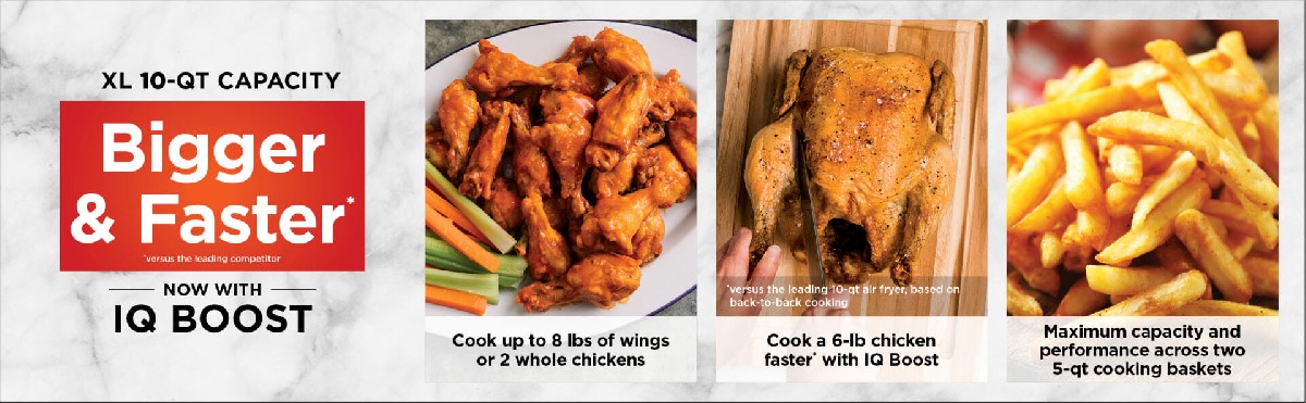 IQ BOOST:optimally distributes power across each basket to cook a 6-lb. whole chicken and side as quickly as possible when Match Cook or Smart Finish is not selected.